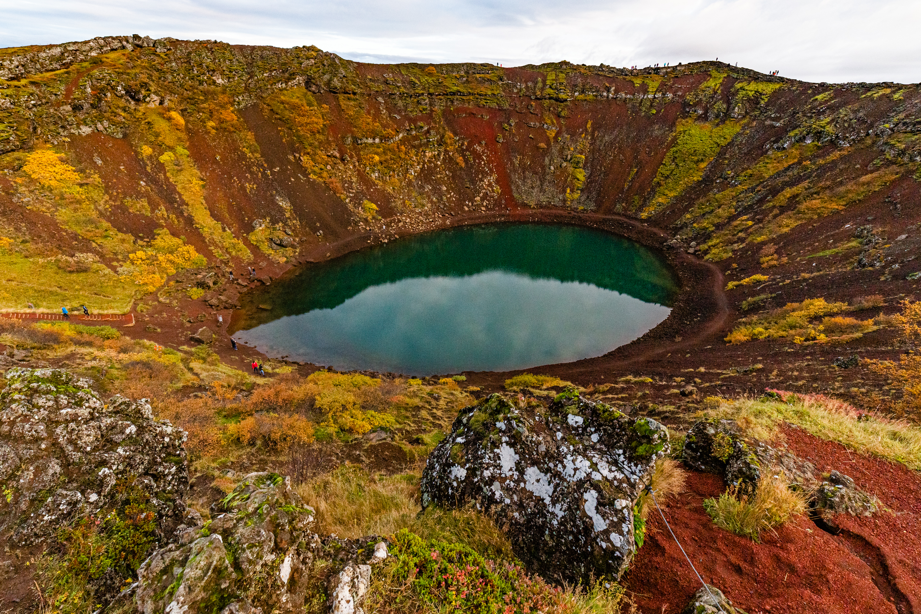• Kerið crater. You might say that the photos from this location are too saturated and the colors are not natural. Yeah, the colors of this otherworldly place are truly unnatural. The deep red soil and the deep blue-green water of the crater lake are there to drop your jaw. This is a 3000-year-old volcanic crater and that’s it. Its waters are somewhere between 7 and 14 meters deep.