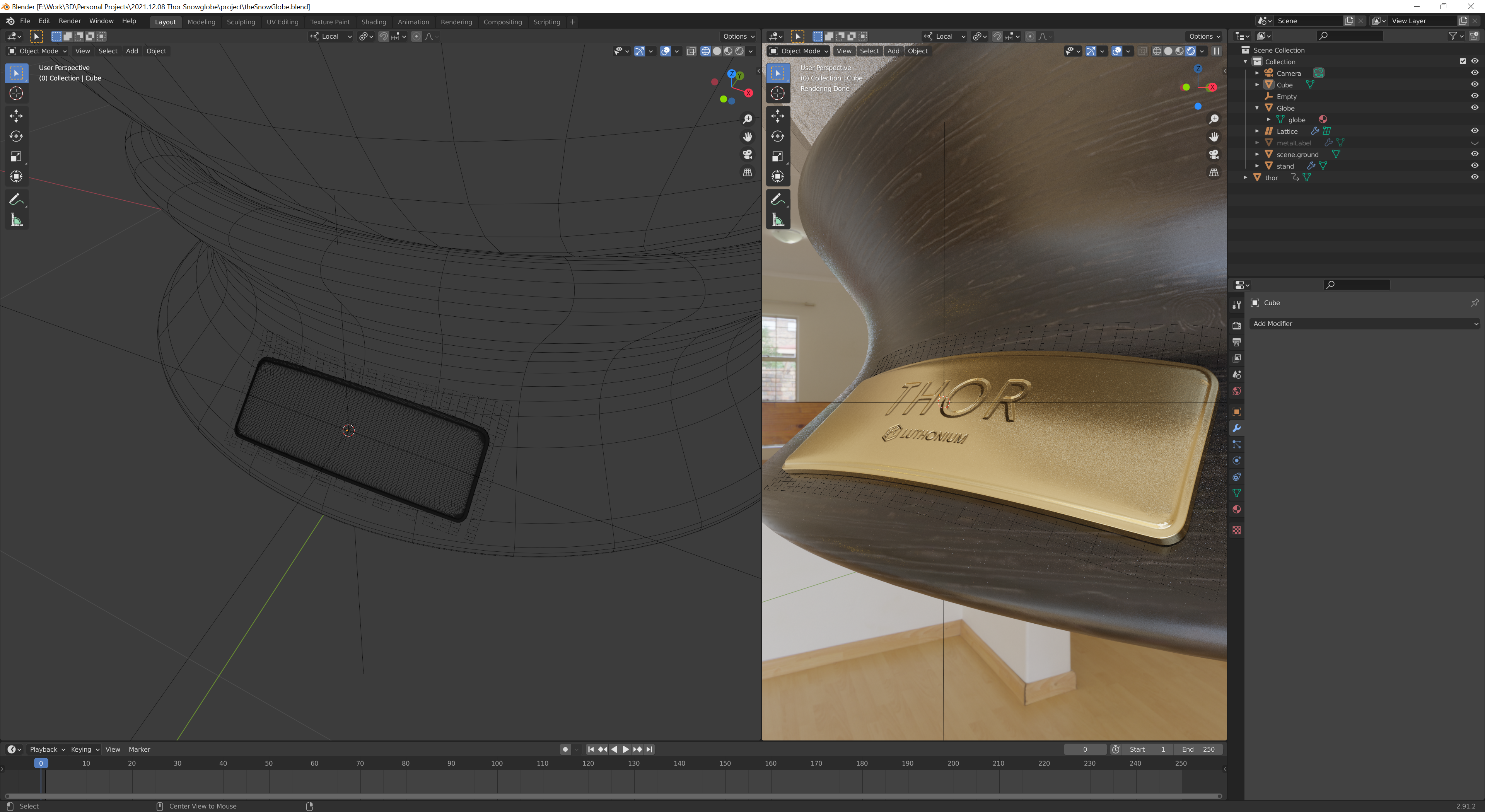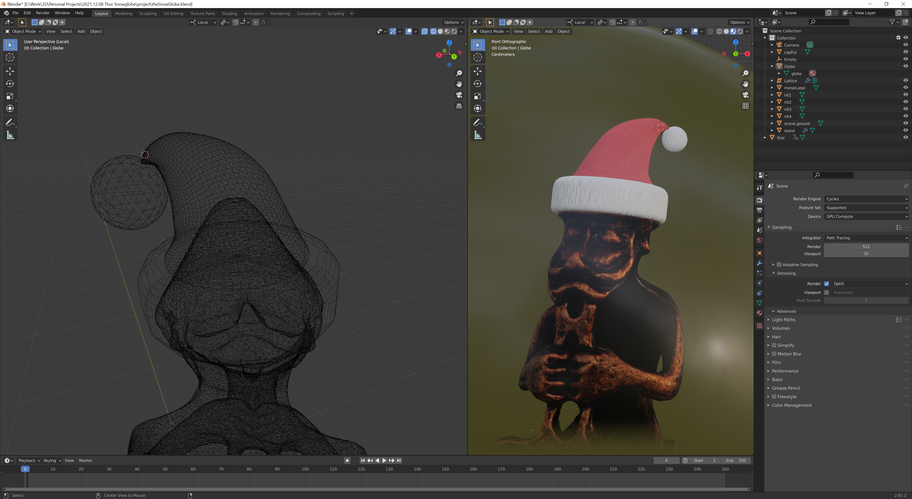I wanted to build a snow globe containing Thor, the 3D model featured on my homepage, that can be used in ThreeJS with falling snow (this one was super optional), in order to update the interactive element on my home page to the Christmas vibes.