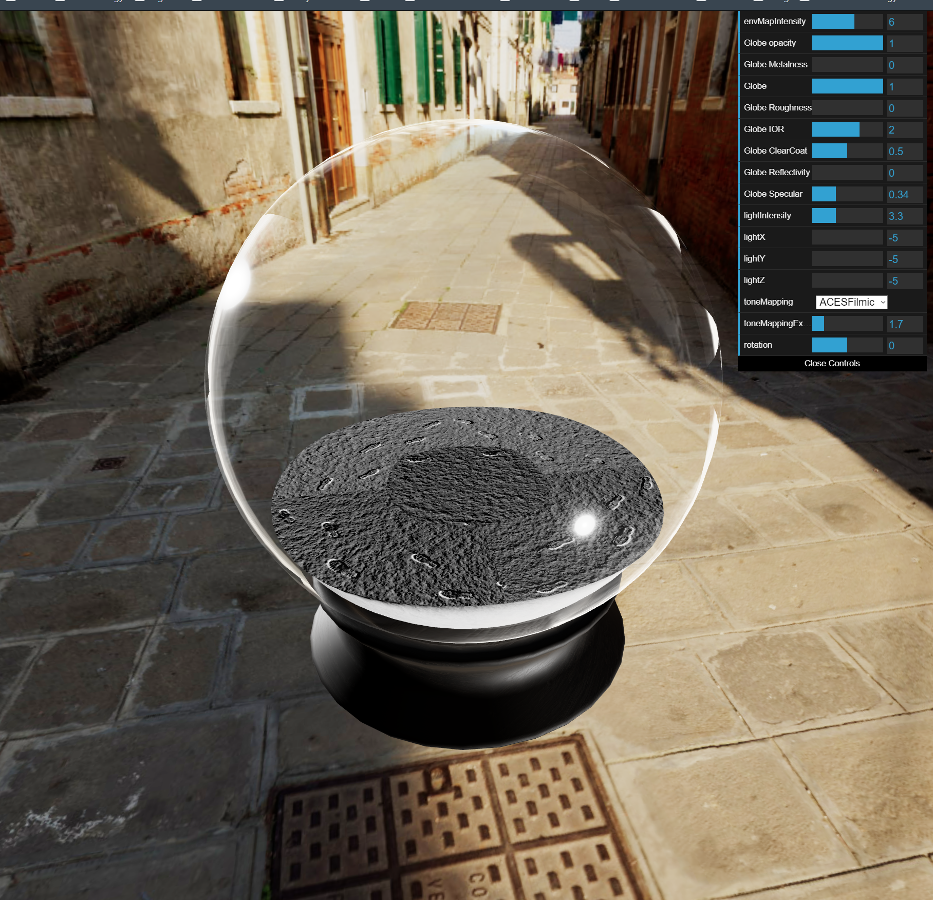 First of all I wanted to see if I would be satisfied with ThreeJS possibilities for the glass globe. I saw some examples, of which I liked only the one from their ThreeJs examples. So I had to research and test.