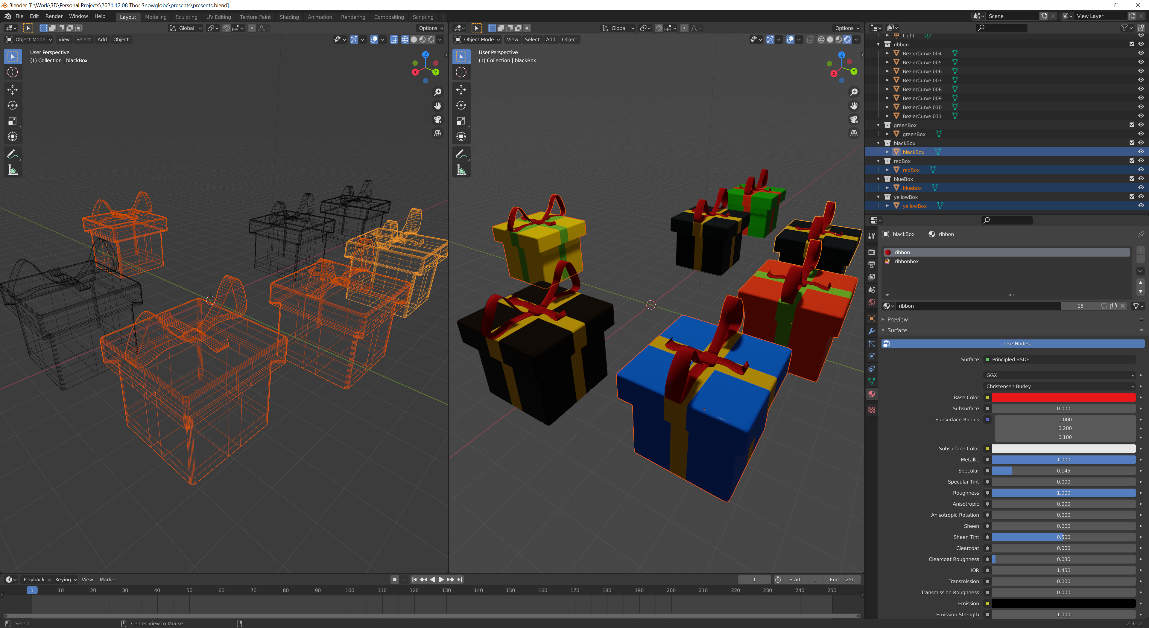 The presents were modeled in a separate blend file. Simple cubes with edge loops arranged for different color mapping. I used the Imphenzia technique for texturing low poly models. The ribbons were made using a Bezier Curve.
