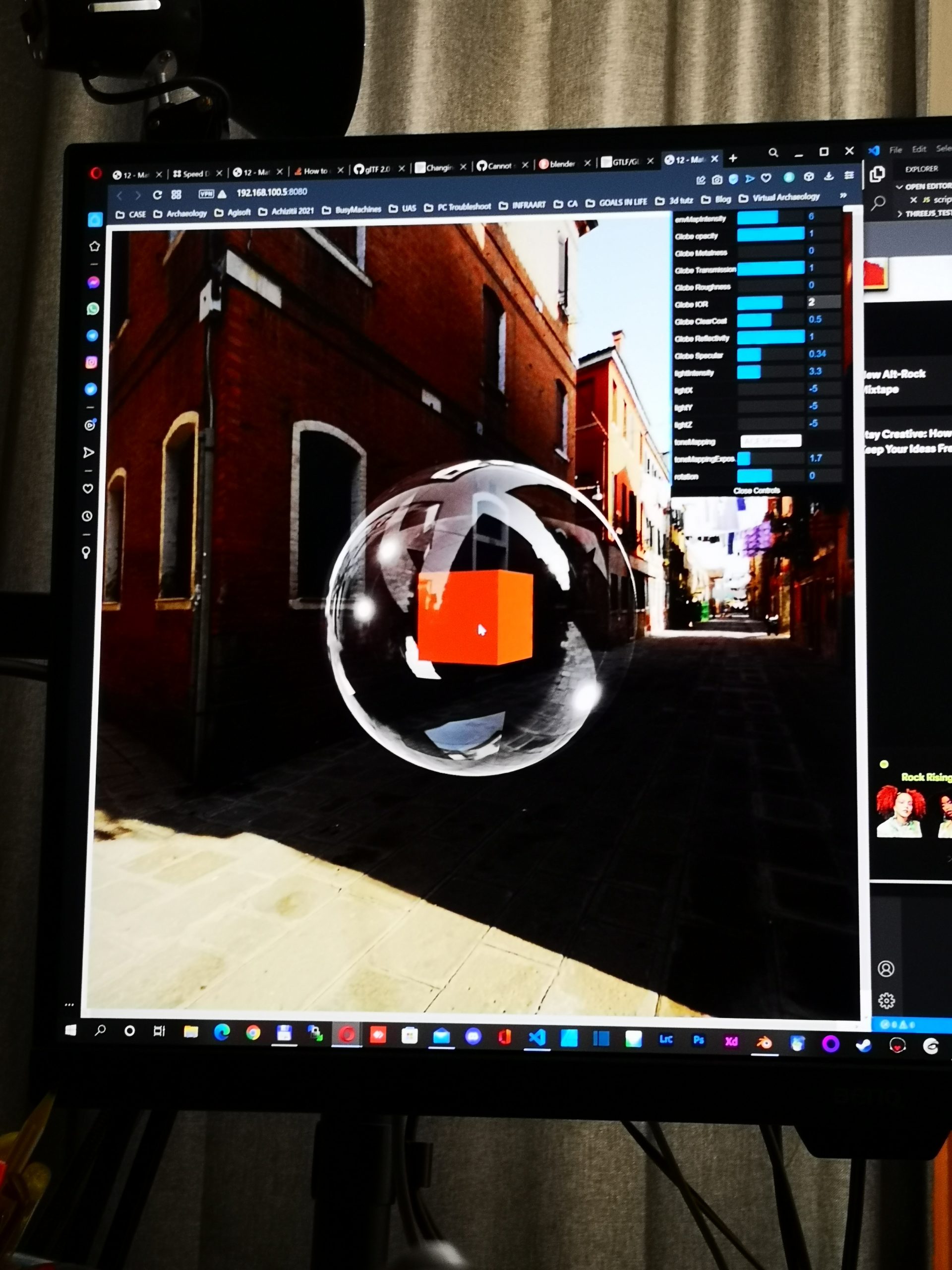 Rewind. Replace the Glass BDSF in Blender with the Principled one and tweak the parameters until I was happy with the Evee result. Evee is the real time wonder renderer from Blender. Exported the mesh again, imported it in the ThreeJs scene aaand …